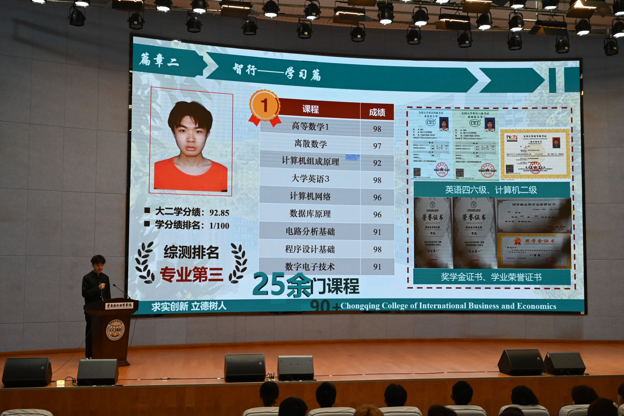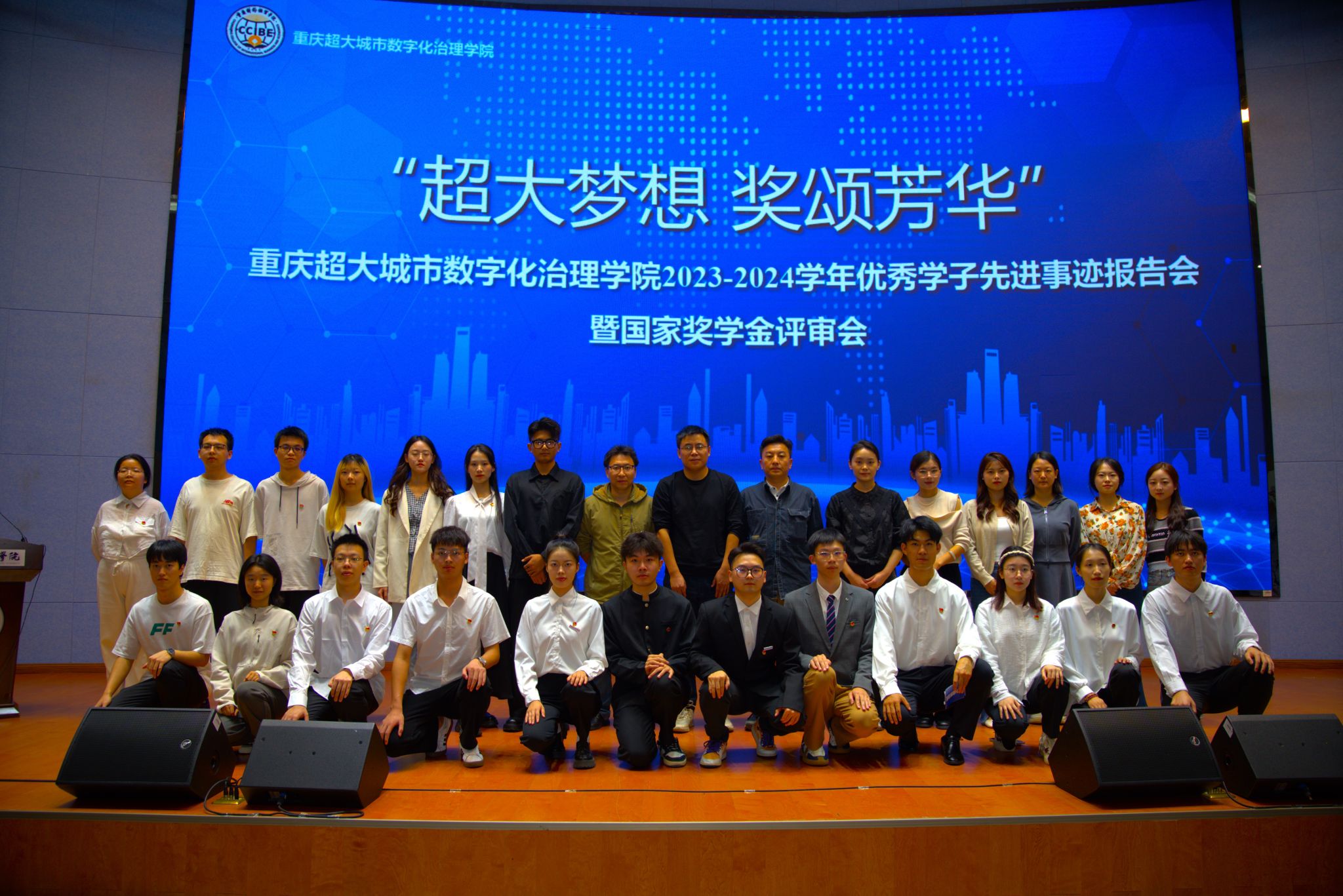 榜样是前行的光,照亮前行的路。为贯彻落实全国教育大会精神, 激发我院学生学习先进,营造优良的学习氛围,发挥榜样的引领作用, 进一步保障国家奖学金评选的公平公正公开,我院于10 月14 日12:20 在重庆对外经贸学院A 校区 9101 举办了以“超大梦想,奖颂芳华” 为主题的 2023-2024 学年优秀学子先进事迹报告大会暨国家奖学金评选。