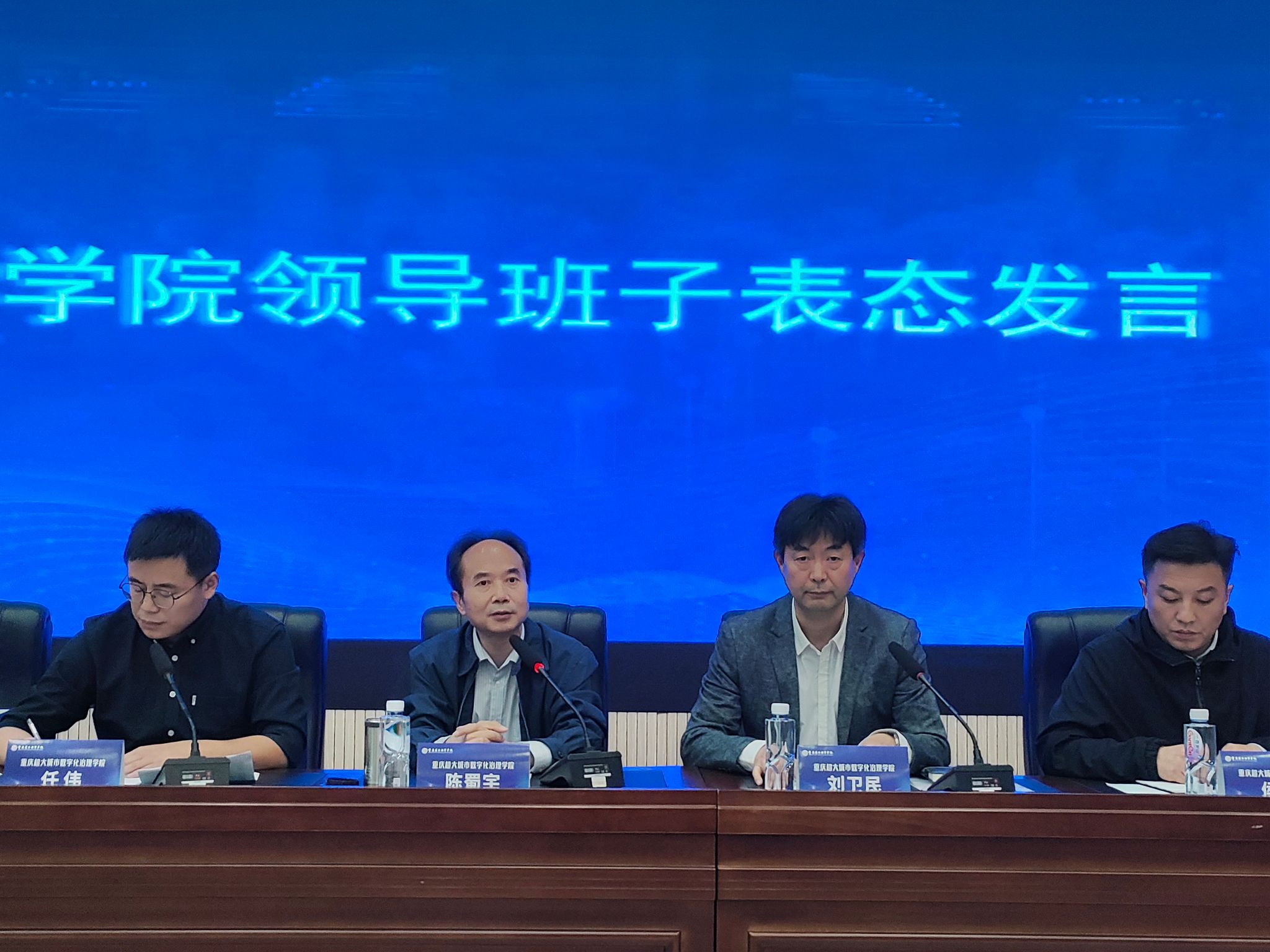 会议伊始,驻校理事、人事处刘卫民处长宣读关于学院成立文件以及领导班子人事任命文件。紧接着是陈蜀宇院长代表学院领导班子成员表态发言,分享学院的愿景与决心,获得了刘卫民处长的认可。