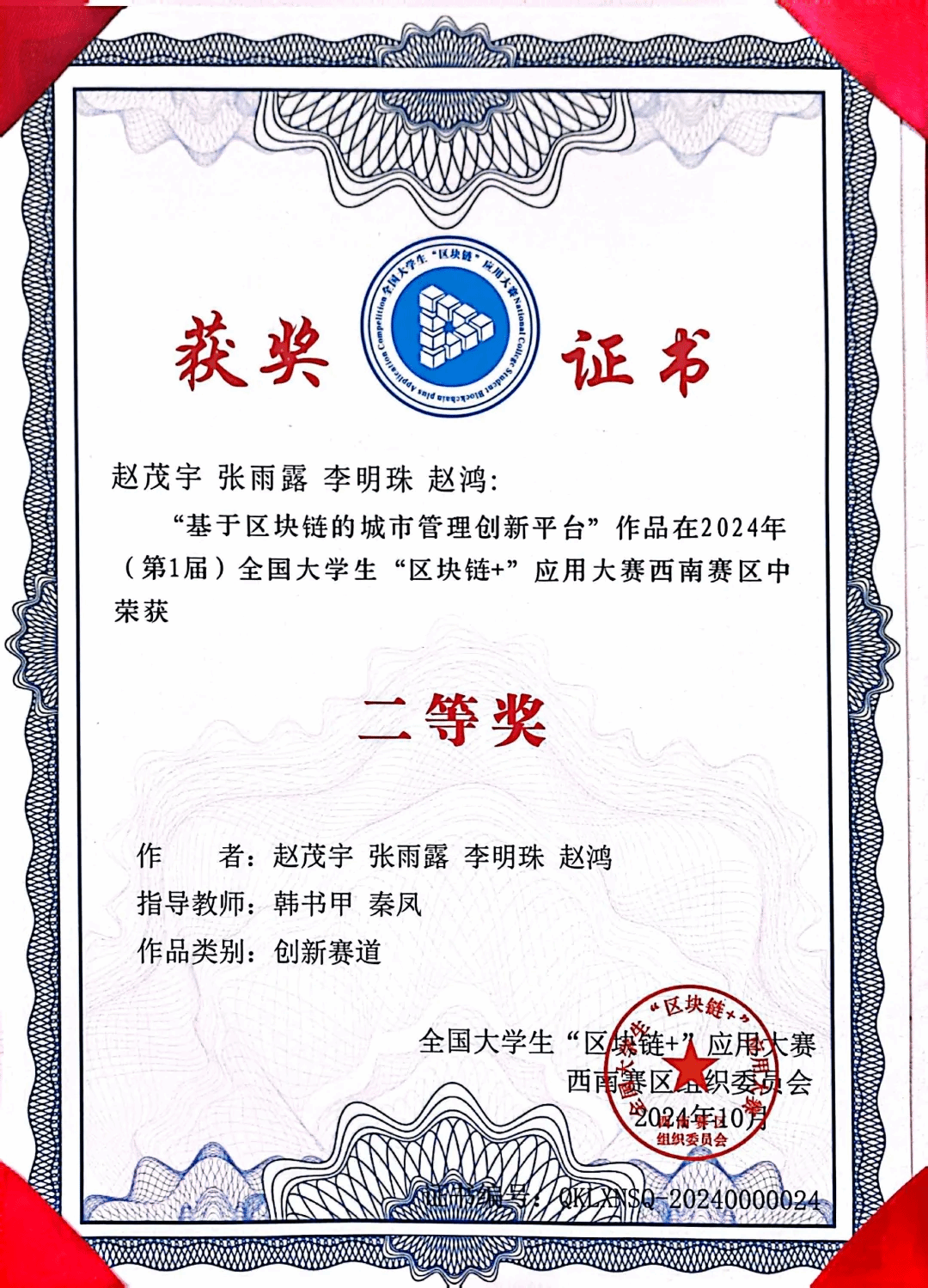 在2024年(第1届)全国大学生“区块链+”应用大赛中,重庆超大城市数字化治理学院的学子们以其卓越的创新能力和实践技能,在众多参赛队伍中脱颖而出,斩获多项大奖。