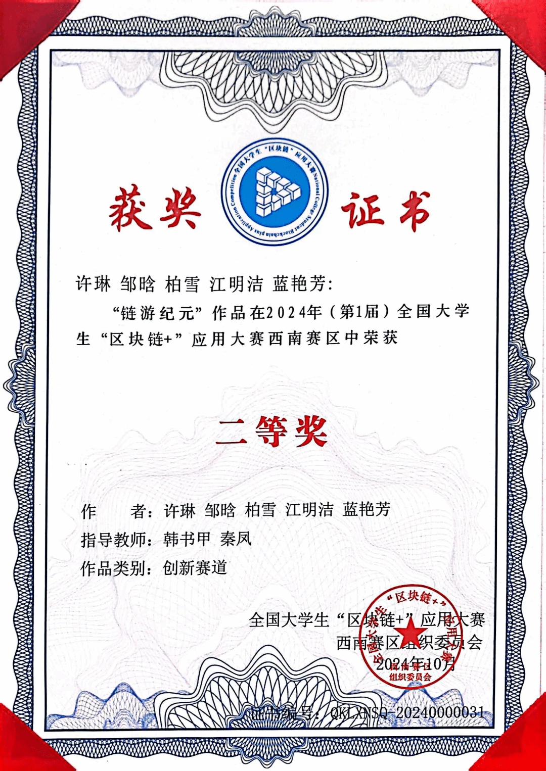 在创新赛道中,由2023级区块链工程专业学生许琳、邹晗、柏雪、江明洁、蓝艳芳组成的团队,以作品“链游纪元”荣获西南赛区二等奖。作品传达了一个基于区块链技术的新游戏时代的开启,其中“链”代表区块链,“游”代表游戏,“纪元”则象征着新的开始和时代。