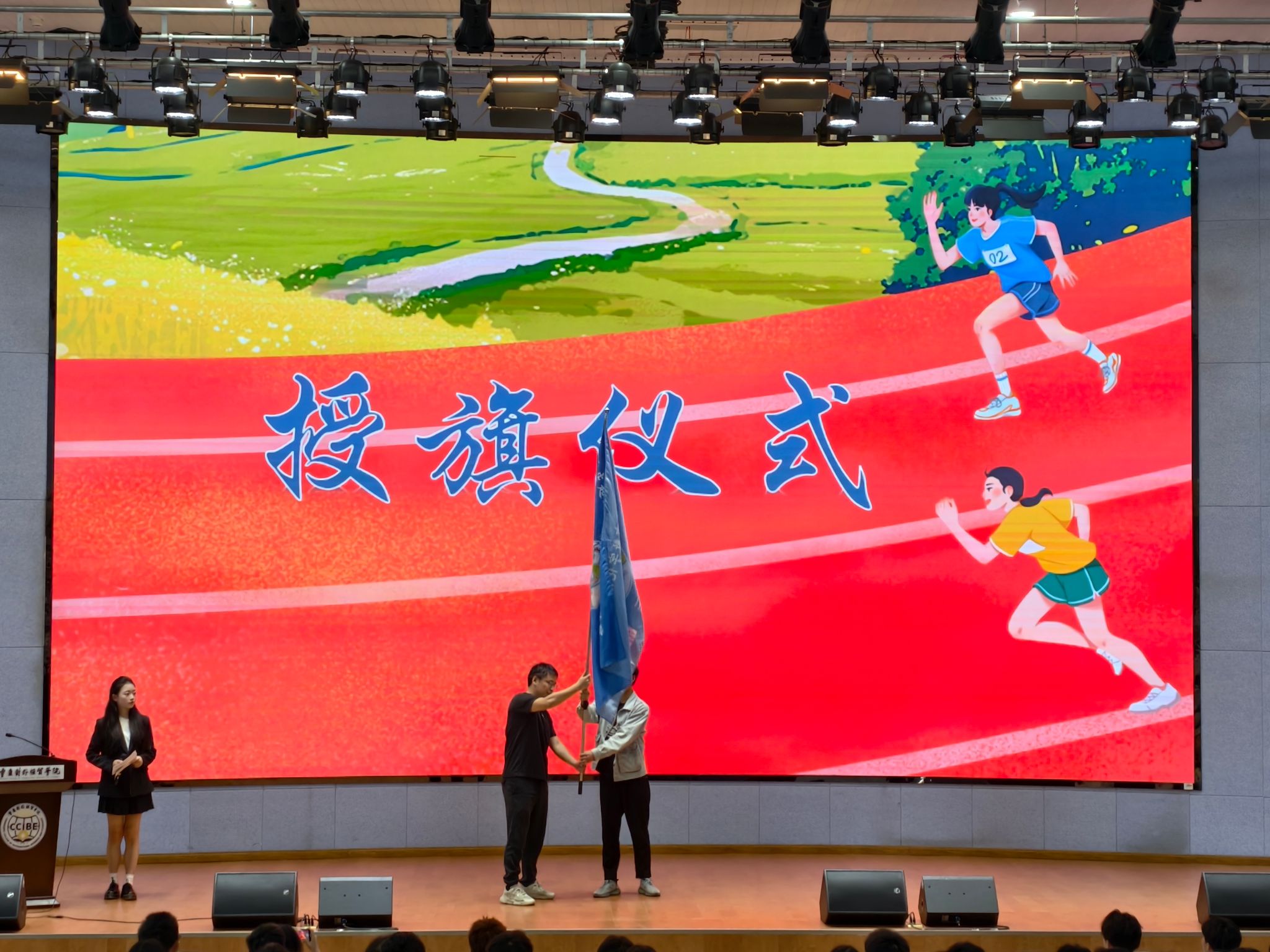 任伟书记在动员讲话中强调:"要在竞技中发扬团结协作精神,展现超大学院的风采。"随后举行的授旗仪式上,印有学院标识的战旗由任书记授予学生代表王一宏,飘扬的旗帜象征着使命的传承,将现场氛围推向高潮。