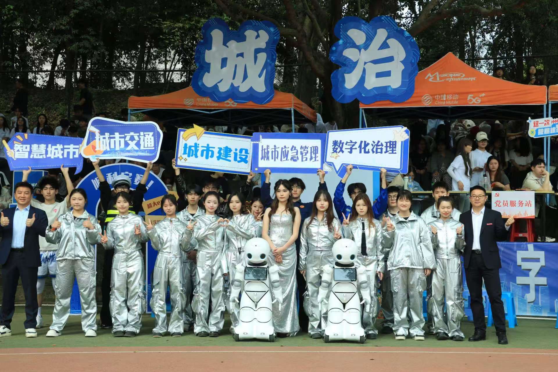 晨光中,校运动会拉开帷幕。作为2024年8月新成立的学院,重庆超大城市数字化治理学院以独具学科特色的方阵完成校运首秀:地面方阵中,身着交通指挥反光服与应急救援制服的学生,与智能机器人同步而行展现人机合一,无人机编队悬挂着“数字赋能育城市治理英才,迎评促建铸贸院美好未来”的横幅划过长空,形成地空联动的智慧城市实景演示。