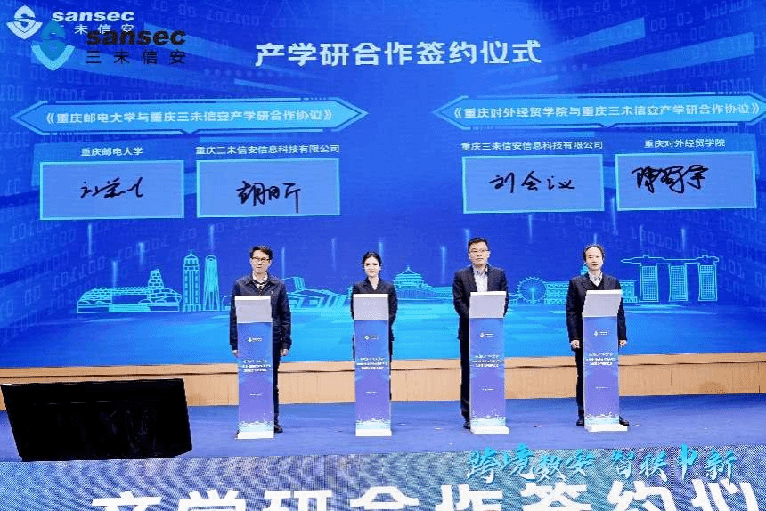 “中新云化数据安全服务平台”隆重揭牌,该平台旨在促进中新两国在数字领域的合作,通过提供全生命周期的数据安全防护服务,保障数据在跨境传输过程中的安全性和合规性。陈蜀宇院长代表我校与重庆三未信安信息科技有限公司签订了产学研合作协议,共同推动学校及重庆超大城市数字化治理学院在中新互联互通项目上的发展。双方将围绕数字技术的基础研究、重大关键技术以及产业共性技术的创新性研究等多个领域,共同探索数字人才的培养和技术产业化的创新路径,促进相关科研成果的市场化转化,成功搭建起产业需求与教育供给的精准对接平台。