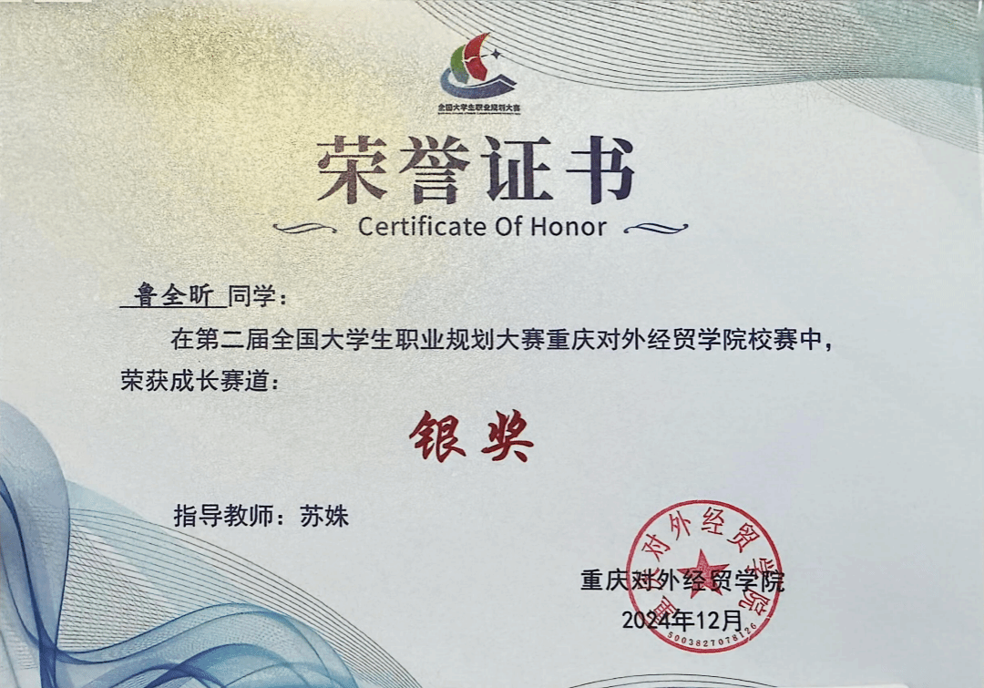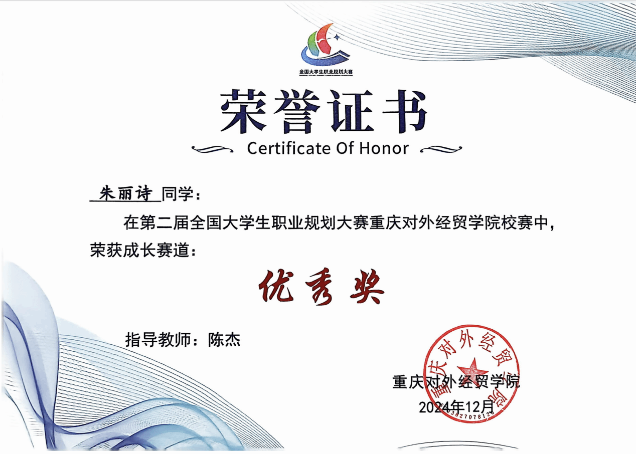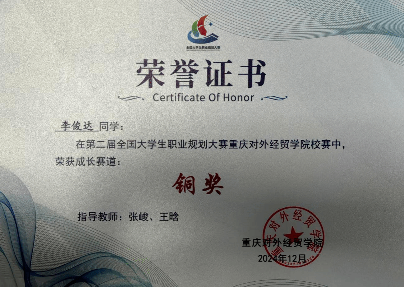 经学院初赛严格评审与推荐,我院易欣、刘江均、朱丽诗、李俊达、焉迅、魏婧雯、鲁全昕 7 名学子凭借清晰的职业定位、扎实的规划方案脱颖而出,成功入围校赛决赛。比赛中,参赛学子充分展现出对职业发展的深度思考、强烈的规划意识以及独具特色的职业发展思路,最终斩获佳绩 —— 荣获重庆对外经贸学院校级金奖1项、银奖2项、铜奖2项、优秀奖2项,为学院赢得荣誉的同时,也为其他学子树立了职业规划的优秀典范。