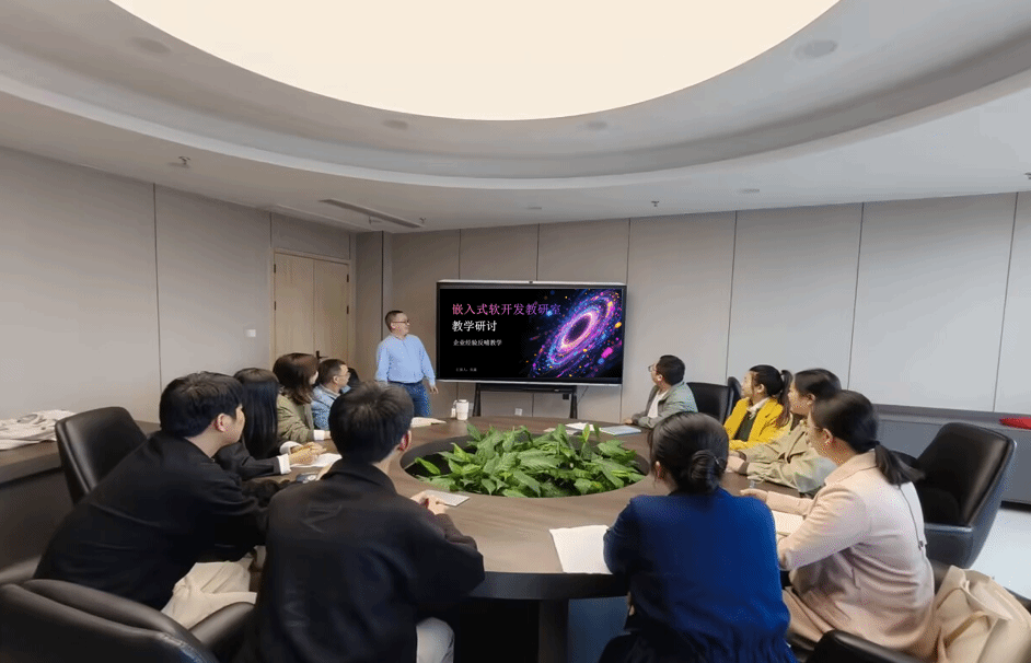 分享中,张鑫老师结合企业嵌入式研发实战经历,围绕产教融合落地路径展开:一是剖析企业项目常用技术栈(如 STM32 开发、嵌入式 Linux 应用)与标准流程,建议将企业项目规范融入课程大纲,实现 “教学内容与岗位标准” 对齐;二是针对产教融合实训设计,提出增设模拟企业项目场景(如团队协作完成小型嵌入式设备开发),让学生在实践中掌握岗位协作能力;三是结合企业技术痛点(如嵌入式系统稳定性调试、低功耗设计),建议引入真实企业案例进课堂,搭建 “企业需求 - 教学实践” 双向反馈桥梁。
