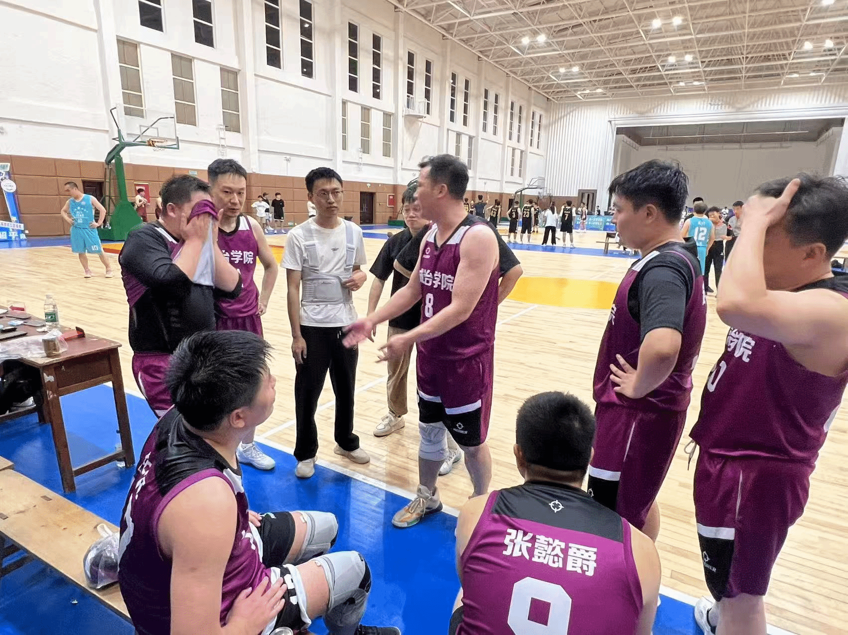 赛事全程,队员带伤上阵、掌心磨破仍坚持;任书记在场边带着哑嗓声助威,凝聚团队力量。小观众举“爸爸加油”手牌、外语学院舞队助威,哨音与欢呼声交织,场馆成情感熔炉。裁判长廖俊沙哑着嗓子执裁,器材组程进单膝调篮架,志愿者送冰桶,细节见温度。