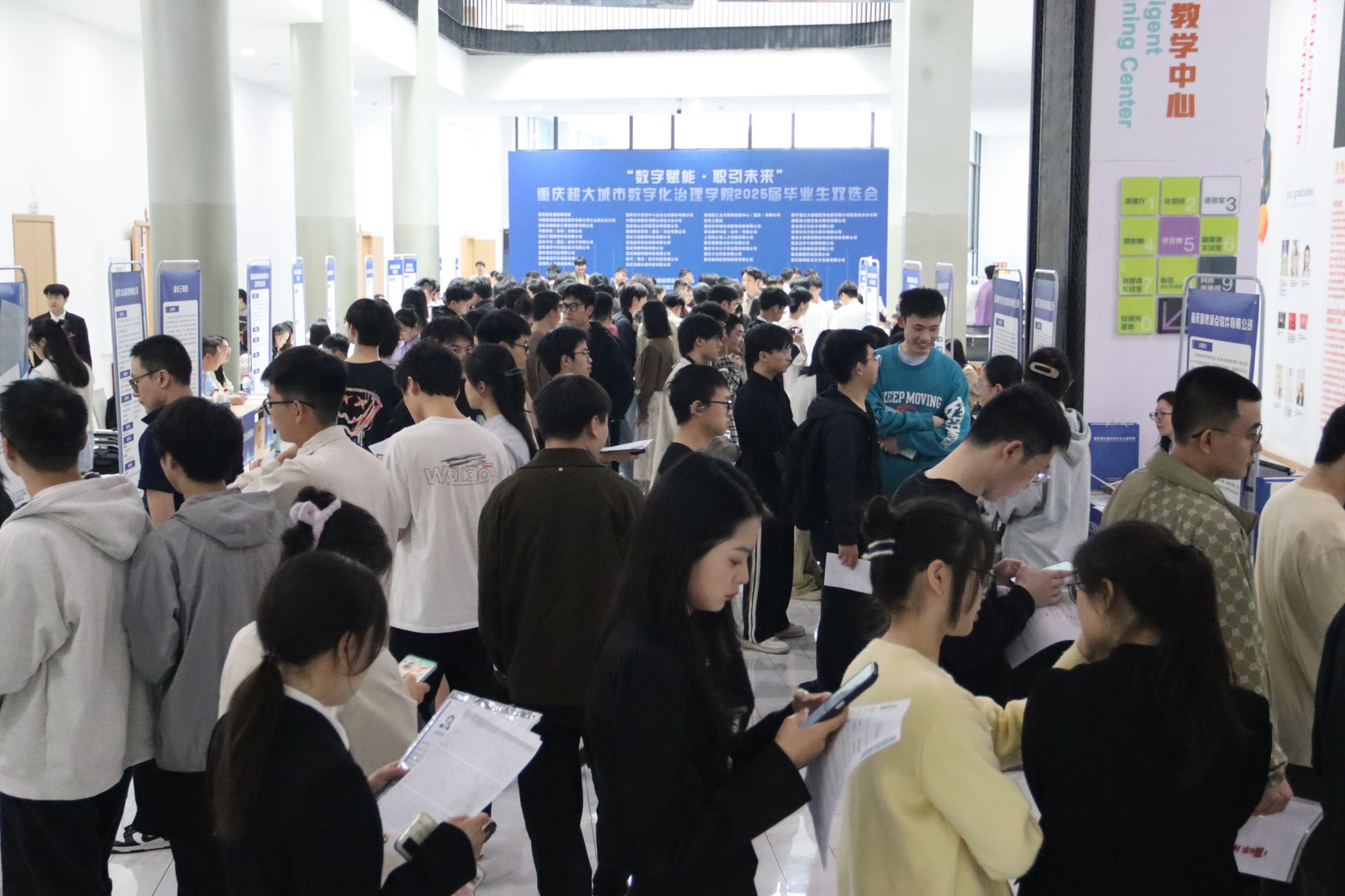 4月11日,重庆对外经贸学院重庆超大城市数字化治理学院2025届毕业生双选会暨首届毕业生专场招聘会在重庆对外经贸学院A校区隆重举行。本次双选会由重庆市大数据应用发展管理局(以下简称“市大数据局”)和重庆对外经贸学院共同组织,汇聚西南地区37家数字经济领域头部企事业单位,提供180余个高匹配岗位,覆盖大数据分析、人工智能开发、智慧城市管理等前沿方向。活动现场我校上千名毕业生投递简历超2000份,初步达成就业意向人数突破300人,实现了人才培养与产业需求的高效衔接,为数字重庆建设注入青春动能。