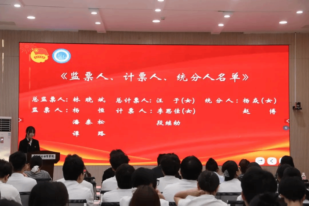 随后,大会表决通过了监票人、计票人、统分人名单。总监票人为林晓斌,监票人有雷彬、潘秦松、谭路;总计票人是汪于(女),计票人包括李思佳(女)、段继幼,统分人有杨焱(女)、赵博。