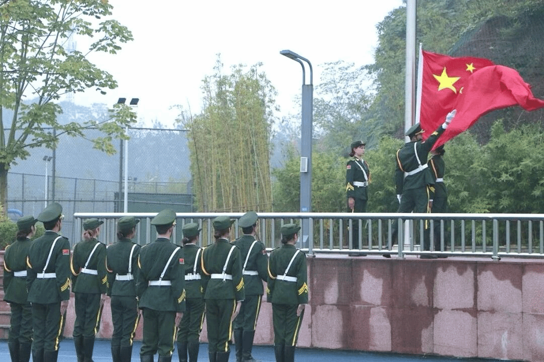 仪式伊始,国旗护卫队迈着铿锵有力的步伐护送国旗入场。师生全体肃立,注视五星红旗冉冉升起,昂扬的姿态展现了青年学子奋发向上的精神风貌。